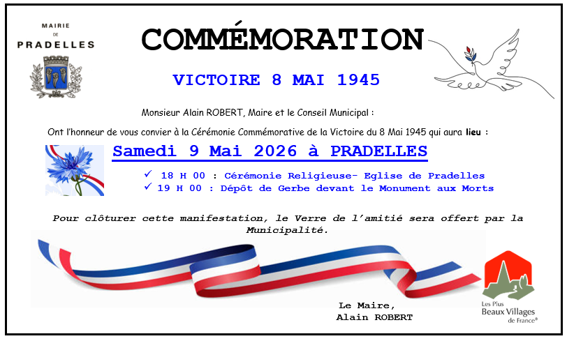 Vous êtes ici : Accueil > Commémoration du 8 Mai 1945- PRADELLES- Samedi 09 Mai 2026